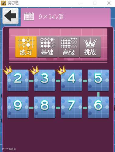 打开心算王,看到9×9与19×19两个板块。(9×9适合学龄前的孩子,19×19适合小学一年级以上学过乘法口诀的孩子)