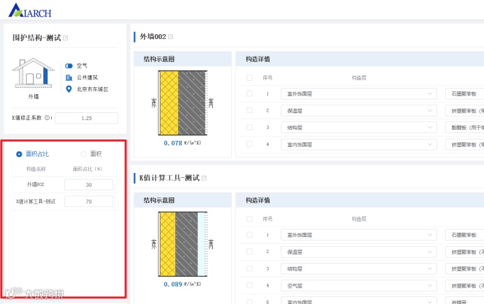 设置好多个构造之后,我们需要填写每个构造在整个围护结构中所占的比例(如果是知道面积也可以填写面积,系统会自动计算所在比例)