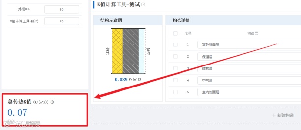 当我们设置好上述所有内容之后,在上图所示位置看到对应围护结构K值实时计算的结果。