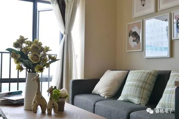 沙发前方的茶几放上一对可爱长颈鹿造型的装饰品,,配上旁边的绿植,为空间注入一抹生动的大自然气息。
