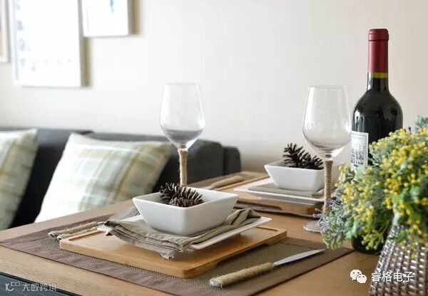 在原木色餐桌上,摆放一些精致的餐具,棉麻质感,天然而不失大气,闲暇时分来杯红酒,气氛轻松随性,趣味盎然。