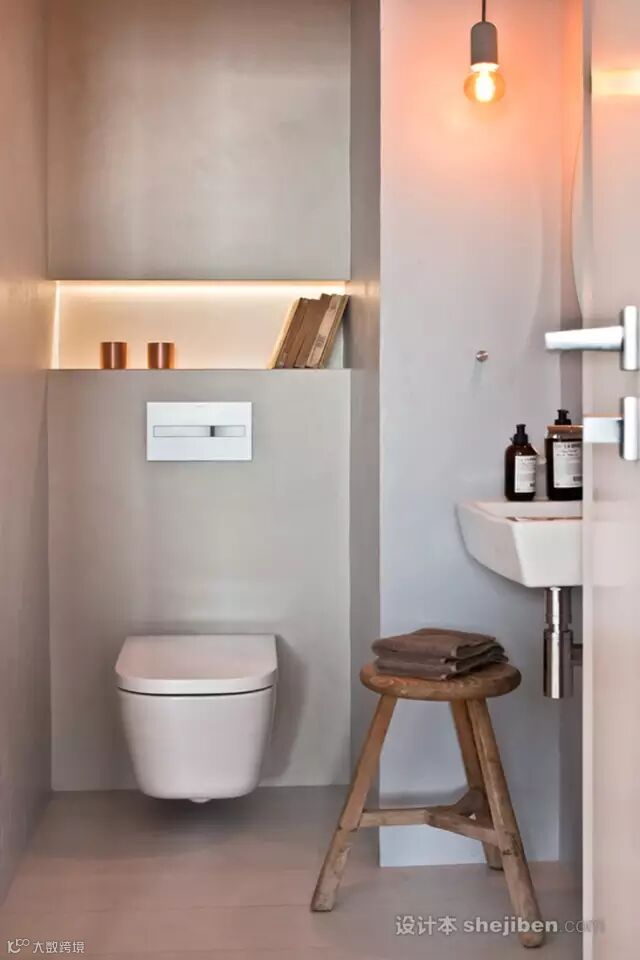 裸露的混凝土与原木置物凳交织出洗手间的原始与质朴。