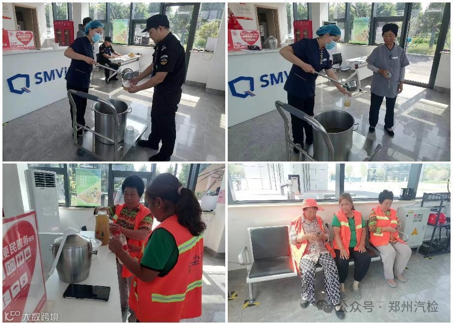 烈日炎炎,热浪滚滚。2024年6月12日,郑州迎来高温红色预警,气温达40摄氏度,郑州汽检聚焦群众需求,开展实践活动,精心熬制的冰镇绿豆汤,为物业和环卫工人等户外工作者送去清凉。