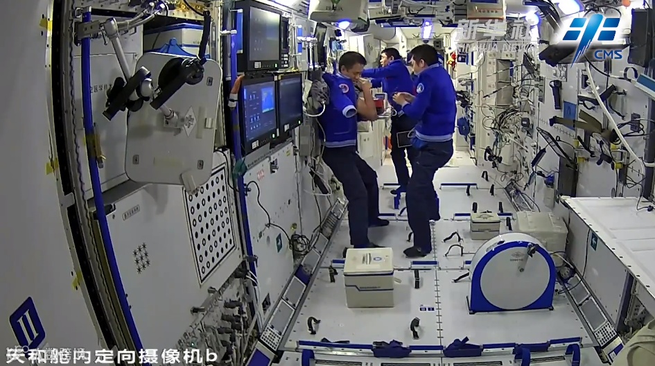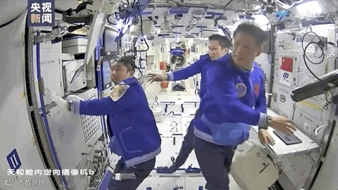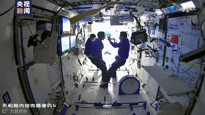 在空间站,航天员一边喝着“太空茶饮”,一边有条不紊地工作,三人沟通交流中还时不时会心一笑,看来他们对各项实验操作充满了信心。