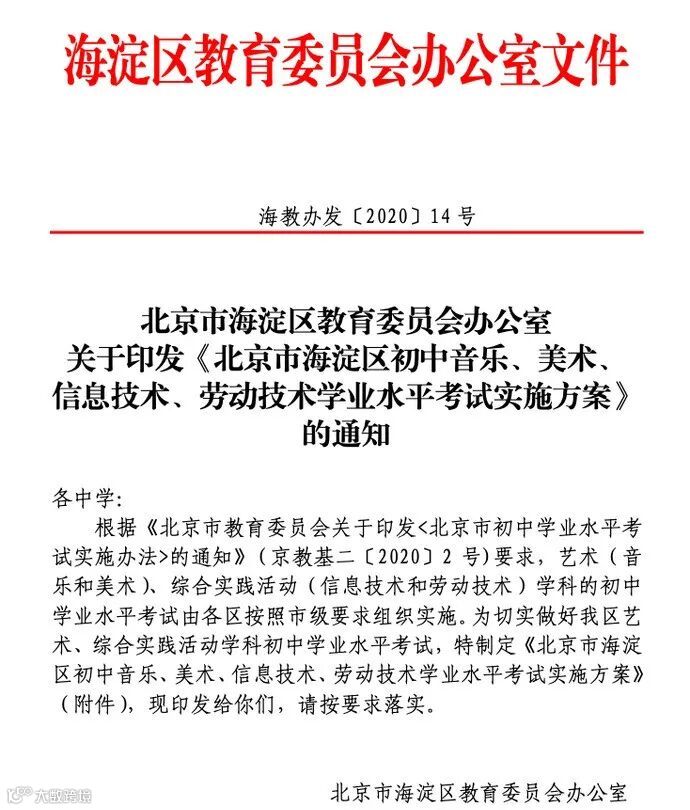 北京市海淀区教育委员会办公室关于印发《北京市海淀区初中音乐、美术、信息技术、劳动技术学业水平考试实施方案》的通知如下:
