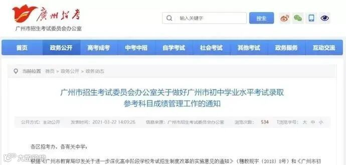 近日,广州市 招考办发布《 关于做好广州市 初中学业水平考试录取参考科目成 绩 管理工作的通知》。