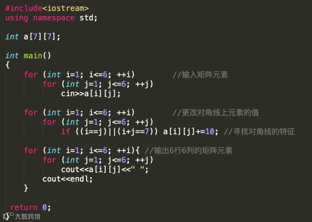 已知一个6x6的矩阵(方阵),把矩阵二条对角线上的元素值加上10,然后输出这个新矩阵。
