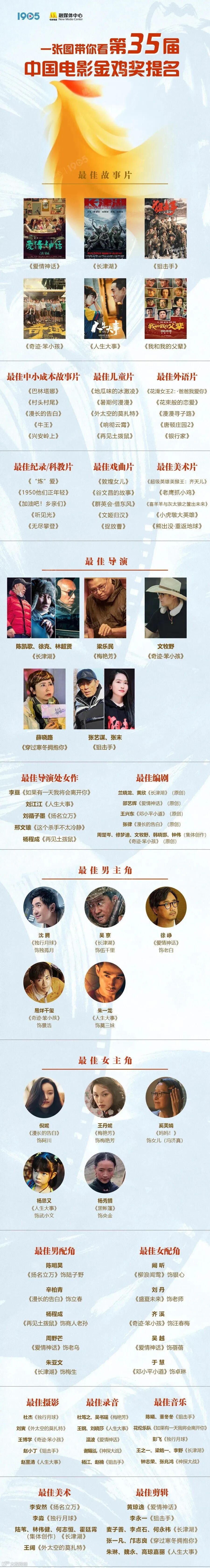 今年又是“神仙打架”的一年,共有47部影片获得提名。由陈凯歌、徐克、林超贤联合执导,以抗美援朝战争时期长津湖战役为背景的主旋律影片《长津湖》获最佳故事片、最佳编剧、最佳导演、最佳男主角、最佳男配角、最佳美术、最佳音乐、最佳剪辑8项提名,成为本届金鸡奖获提名最多的影片。