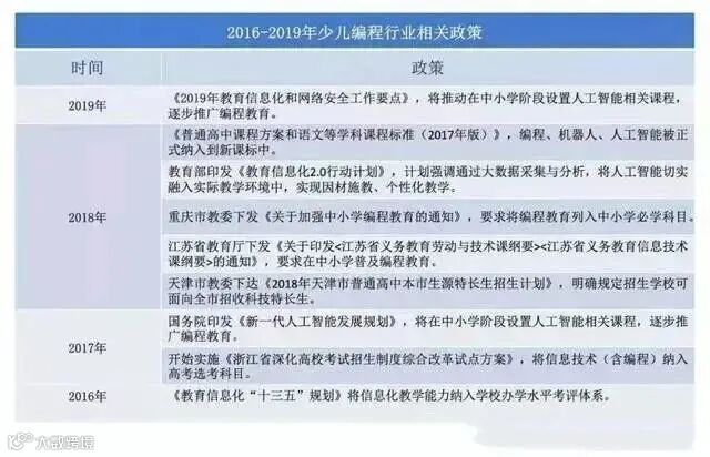 从近两年出台的政策来看,政府对编程教育的支持力度越来越大,使得编程教育对整个教育行业都带来了巨大的冲击。我国少儿编程正经历从“非刚需”向“刚需”的转变。