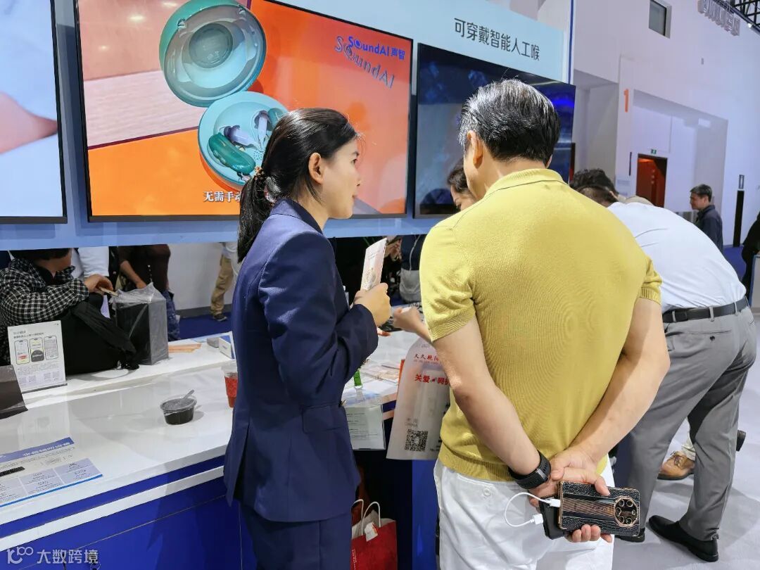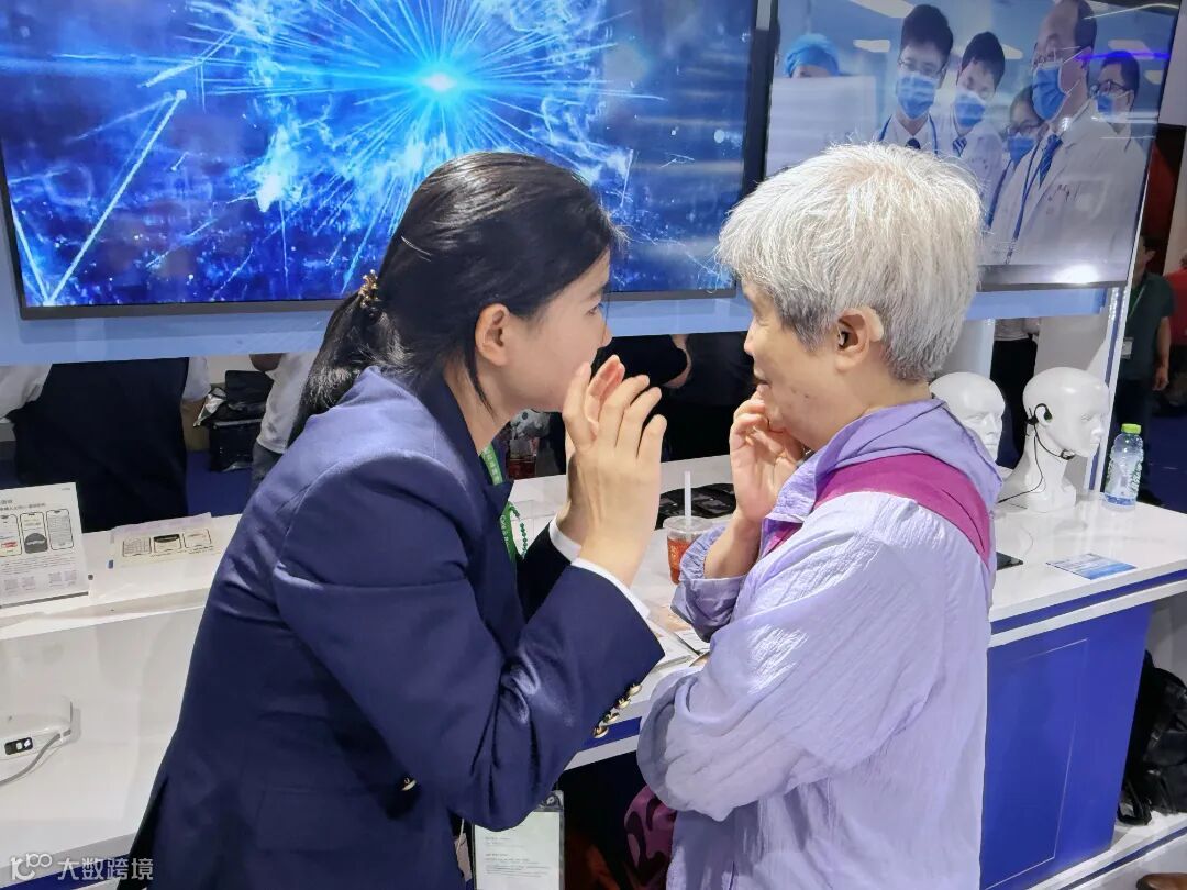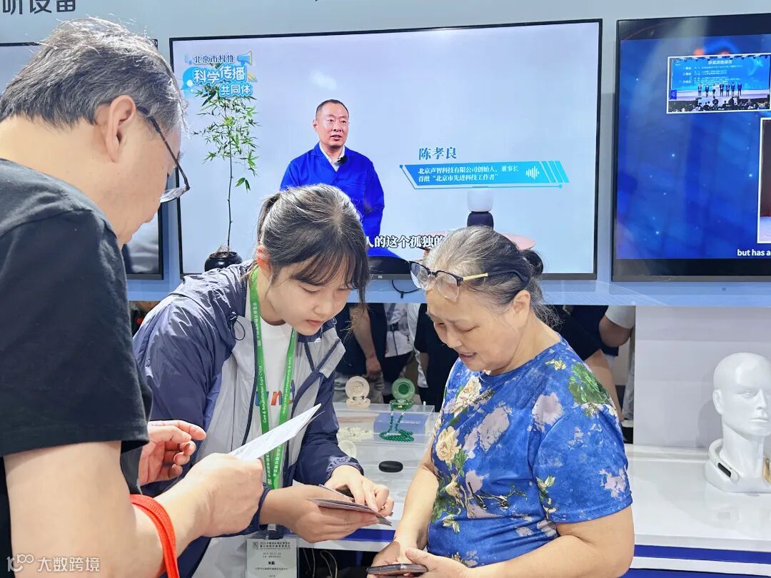 展会现场,声智展区吸引大量观众驻足体验。一位来自北京的李奶奶在试戴后称赞道:“效果比我以前用的助听器好很多,声音清晰、也没杂音,真的很不错!”"用手机APP几分钟就自己调好了,这款AI助听器操作非常简单,还有语音引导,对我们老年人特别友好。"