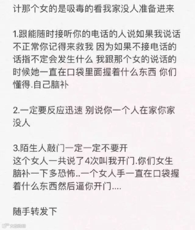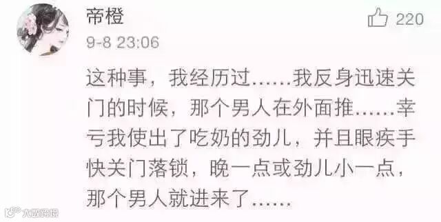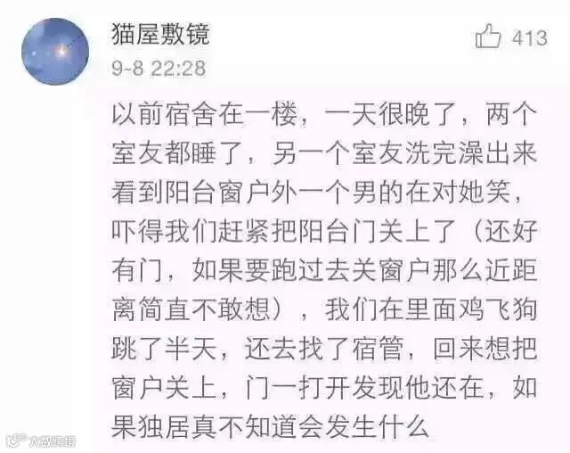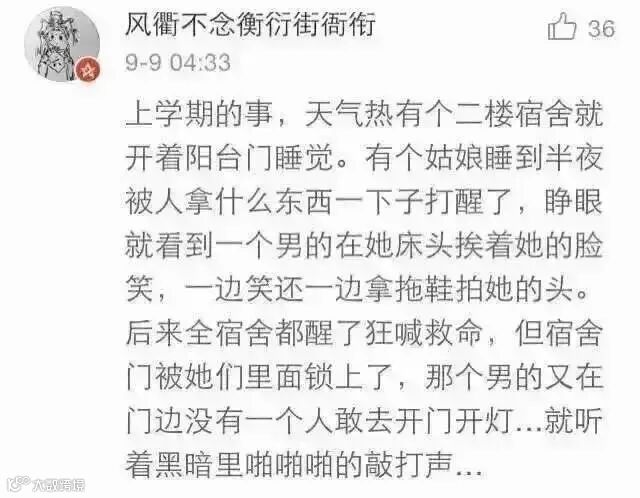 @离枝言:高中住宿的时候,有一次晚上睡觉忘记锁门,舍友睡在离门最近的那个床,半夜两点多,有一个男的伸手在她床头一直摸,她惊醒大喊了一声,谁啊!然后那个男的竟然还说,我找人!然后就走了,我们全宿舍惊醒,从此一到晚上都要把门堵死了才敢睡。