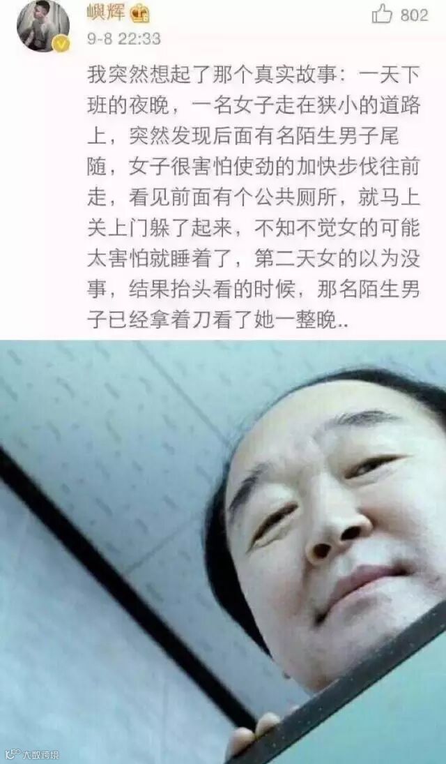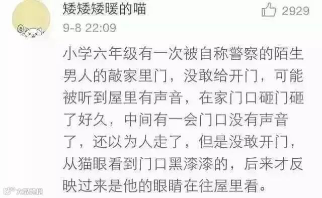 @会卖萌的胖子能得到天下:想到那个看一百次都觉得细思极恐的小故事。就是出租房里进来小偷,女主假装熟睡,想着小偷偷完走掉了就没事了,过了好久没了声响,女主睁开眼睛,耳朵旁有人缓缓地说了一句,我就知道你是装的。