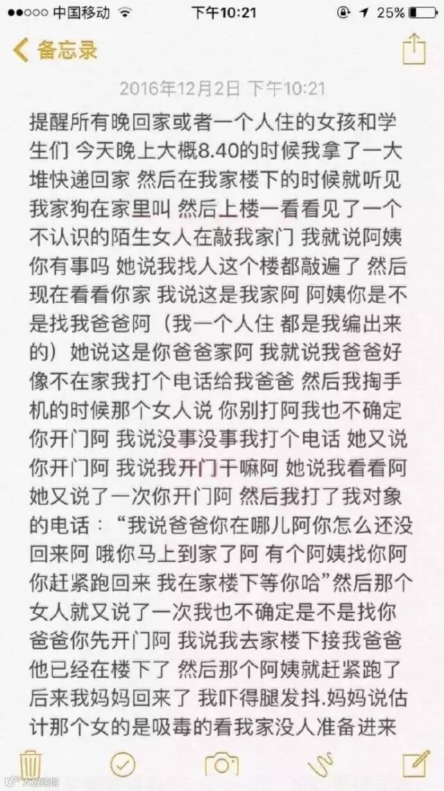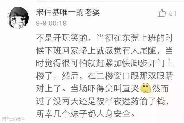 @陈陈vvv:跟闺蜜两个人在外地租房子 他晚上去上课回来的时候给我打电话说有人跟着他 我就赶快下楼等他 听见大门口一声大叫 我赶忙过去 闺蜜再哭 他说一个穿拖鞋的老男人一直跟着他 跟到他小区从后面抱住可她 她大叫我跑过去那男的就跑掉了 真是再也不敢一个人走夜路了