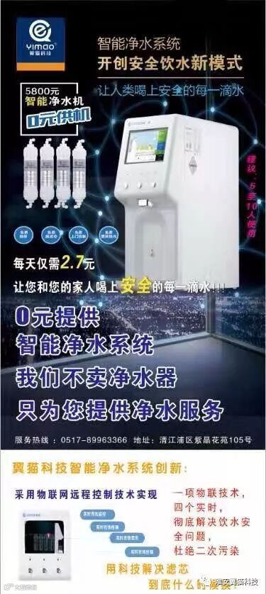 翼猫科技首款产品智能净水系统采用自主知识产权的远程物联网监控技术,每6秒检测一次水质安全,一旦监测到水质出现问题,系统会发出警报并立即切断水源,服务人员第一时间主动预约,上门免费解决问题。