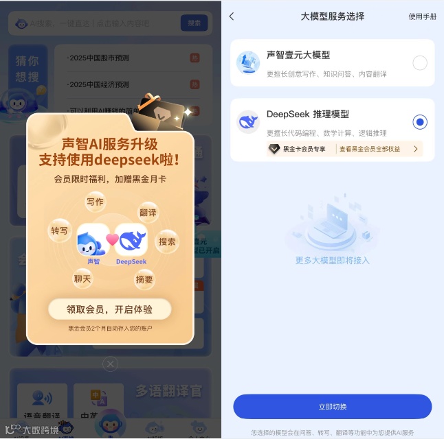 但声智的脚步从未停歇,为进一步拓宽用户体验边界,声智APP正式携手DeepSeek 。在保留AzeroGPT作为服务底座的同时,声智 APP 的智能问答、智能写作,翻译转写等功能可以根据用户自身需求和使用场景,灵活切换大模型,享受更加个性化、多样化的 AI 服务。
