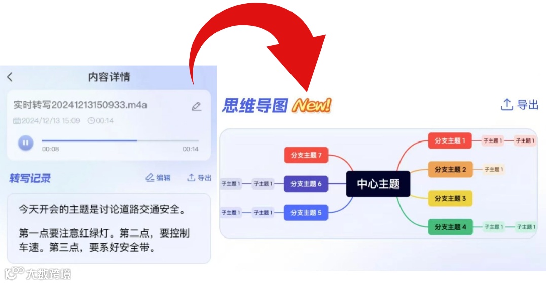 实时录音转文字功能进一步升级,不仅转写精准高效,在完成转写后,你还可以一键将内容导出为思维导图。无论是会议记录、课堂笔记还是个人灵感整理,都能助你轻松梳理逻辑,构建清晰的思维框架,让你的想法不再杂乱无章,工作学习效率直线提升。