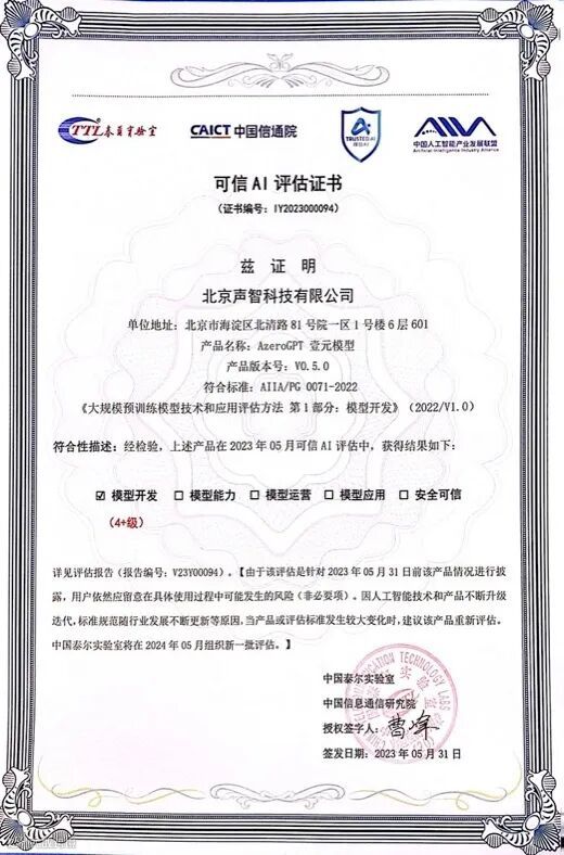 为进一步推进AI技术产业应用水平,增强用户对产品选择可信度,服务企业采购和使用人工智能产品的全流程,中国信通院联合产业各方启动了大模型标准体系2.0编制工作,声智科技AzeroGPT壹元模型符合模型开发标准中的4+级要求。