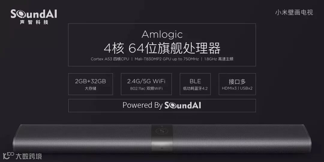 小米壁画电视主机延续小米产品一如既往的简约风格,流线型机身,内置6个发声单元,支持Dolby和DTS-HD双解码,配置有2.5英寸中低扬声器x2、20芯球顶高音x2和倒相式音腔X2,超重低音炮11升大音腔。声智科技为小米壁画电视主机内置的Soundbar量身定制了4麦线型麦克风阵列,搭配专属远场语音识别、语音唤醒等技术,为用户带来更加流畅自然的家庭智能影院新体验。