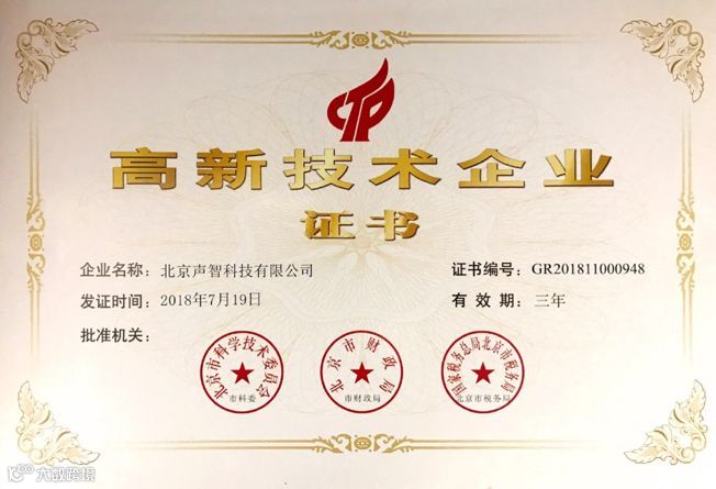 2018年11月,声智科技收到了国家高新技术企业认定的荣誉证书,以表彰声智科技持续进行技术研究与转化,积极构建核心自主知识产权的成果。