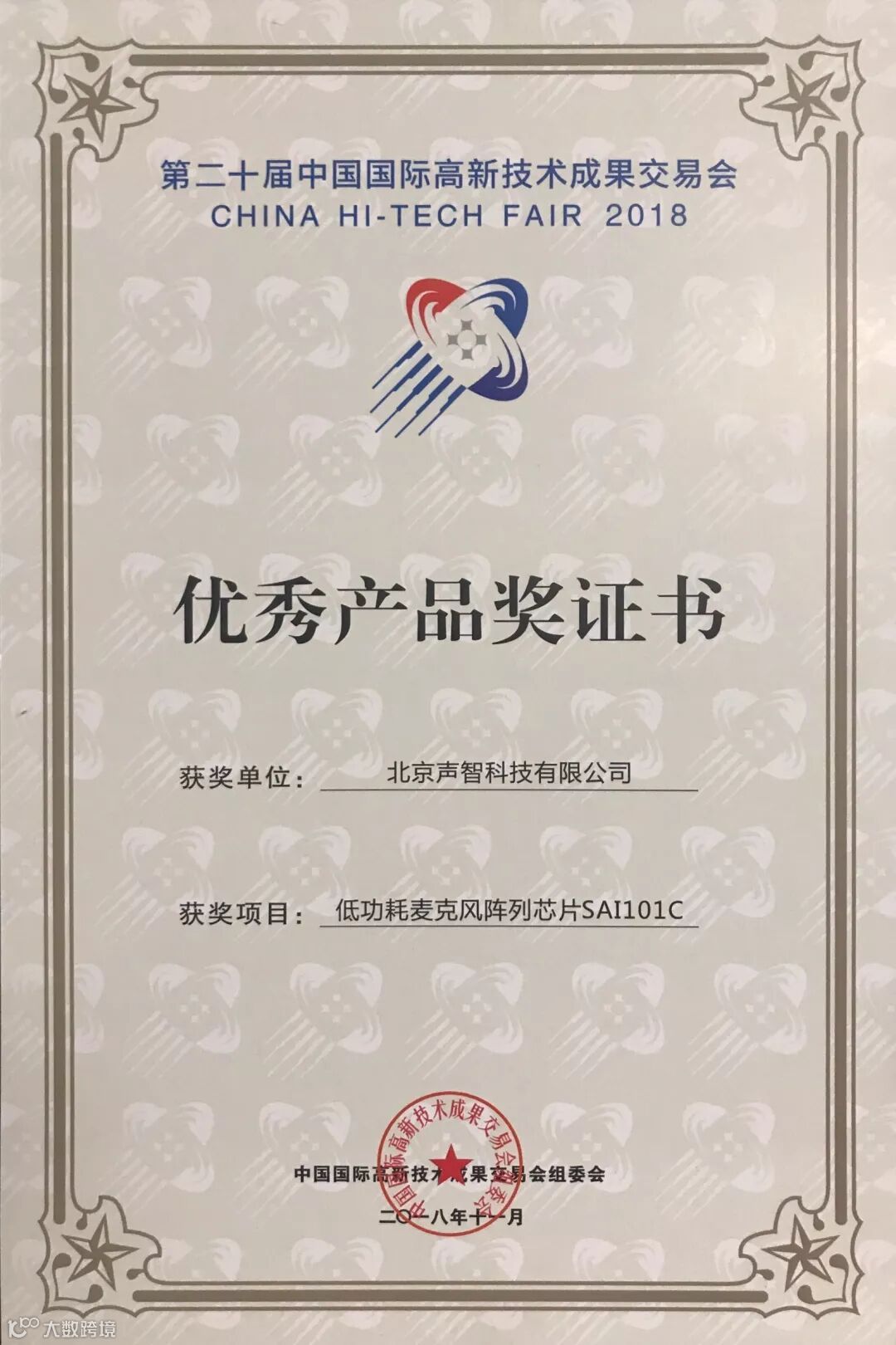 2018年11月18日,第20届中国国际高新技术成果交易会(高交会)上,声智科技国内首款低功耗麦克风阵列芯片SAI101C摘得“优秀产品奖”。