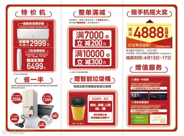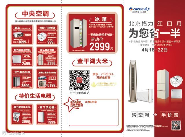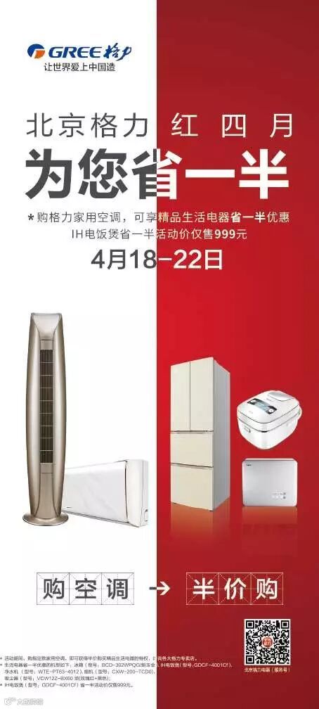 活动期间,凡购买格力空调金贝、玫瑰、汉白玉、I慕等指定机型,在活动价的基础下,可享受精品生活电器省一半优惠。