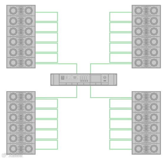 L35线阵单元有一个内置的双向开关,当使用四芯线缆时,用户可以在两个输入信号之间进行选择。这有助于为小型或大型系统的搭建创建更整洁的布线,因为用户只需要用到一半数量的线材。在标准的设置中,四只L35可以并联,而开关功能允许用户只使用一条四芯线就可以连接8只音箱。