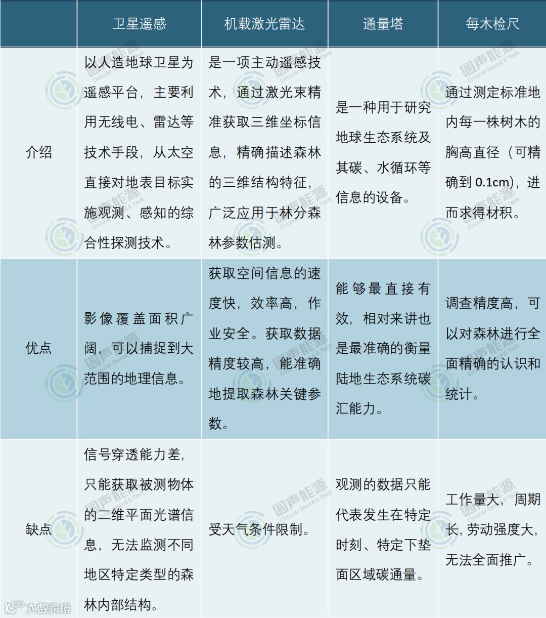 (5)总结:下表对卫星遥感、机载激光雷达、通量塔以及每木检尺在林业碳汇监测方法的优缺点和适用性进行了对比。