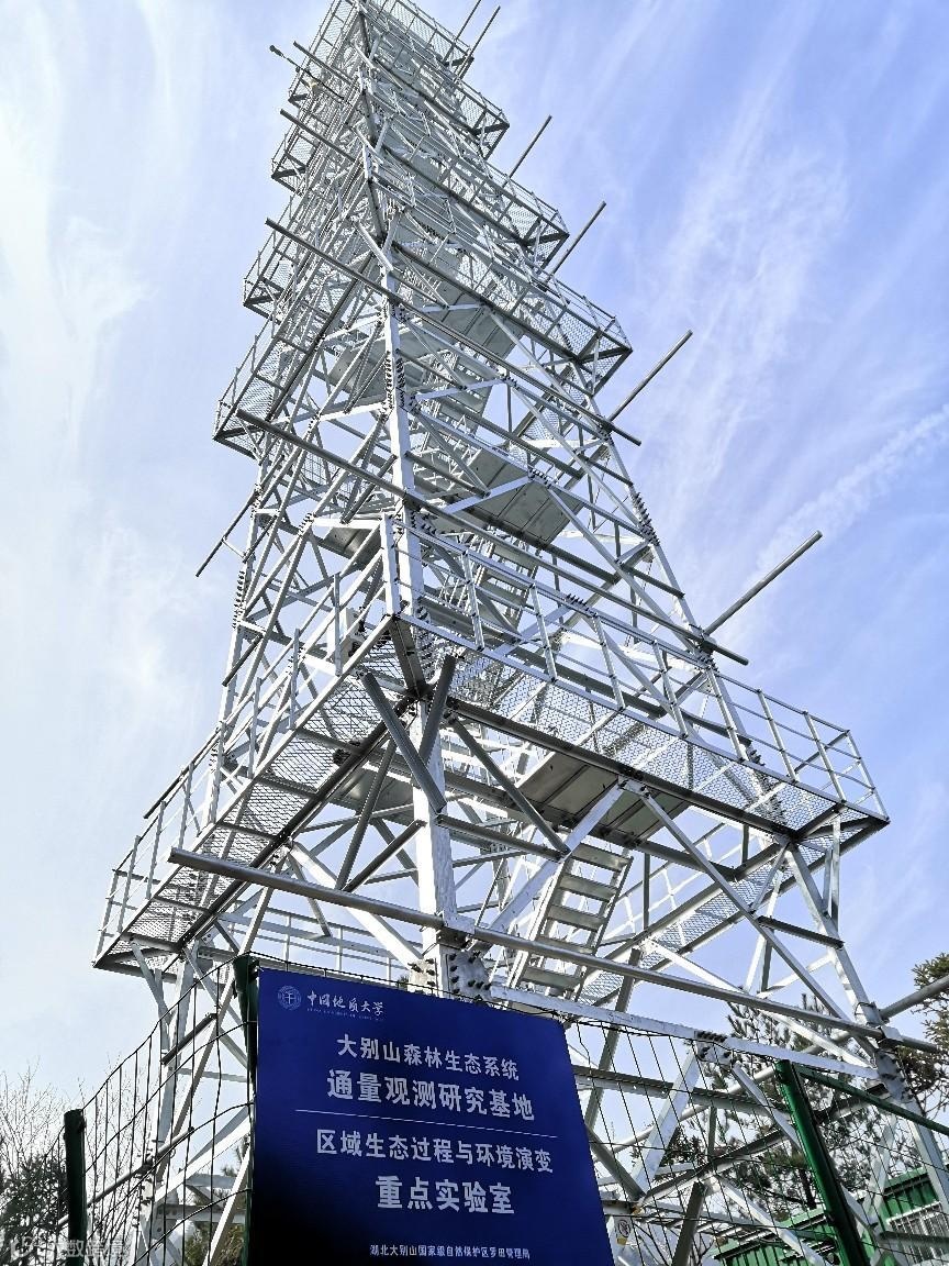 (3)通量塔:是一种用于研究地球生态系统及其碳、水循环等信息的设备。通过对气体在垂直方向上的传输过程进行观测,来测量某个区域的气体通量。有助于深入了解森林在生态系统碳汇服务功能的潜力,是开展野外科学观测研究及相关科研基础性工作的重要平台。