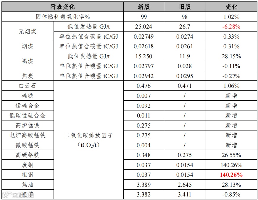 钢铁行业工艺复杂,计算数据涉及参数较多,为规范核算规则,新版取消了化石燃料元素碳实测计算公式,要求各燃料品种对应的单位热值含碳量采用附录 A 附表 A.1 规定的缺省值,相比于旧版而言,缺省值变化不多,主要是无烟煤、烟煤、褐煤、焦炭有调整,详见表2。