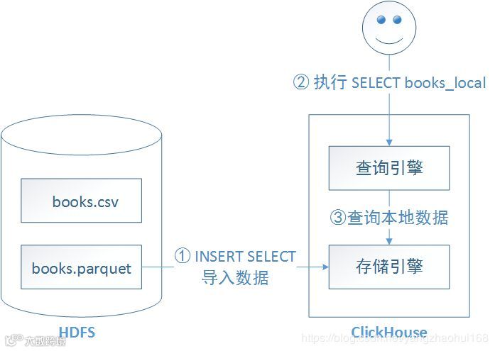 从HDFS导入数据到ClickHouse,然后查询ClickHouse本地表的数据流向图如下: