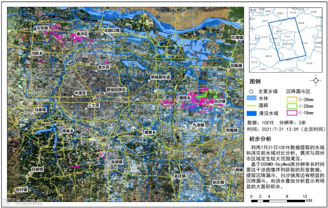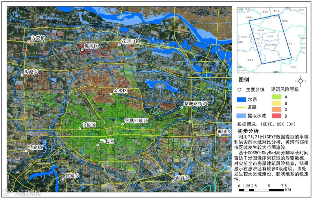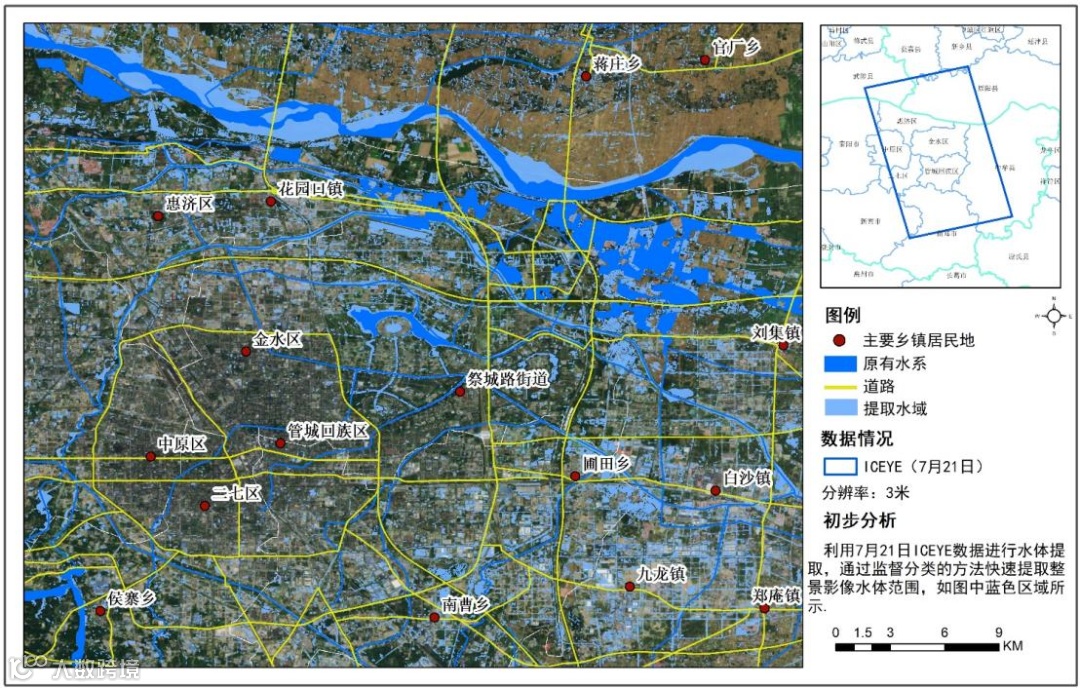● 7月18日获取COSMO-SkyMed 3米分辨率数据,7月21日获取ICEYE 3米分辨率数据,用于分析灾后的洪水淹没范围。