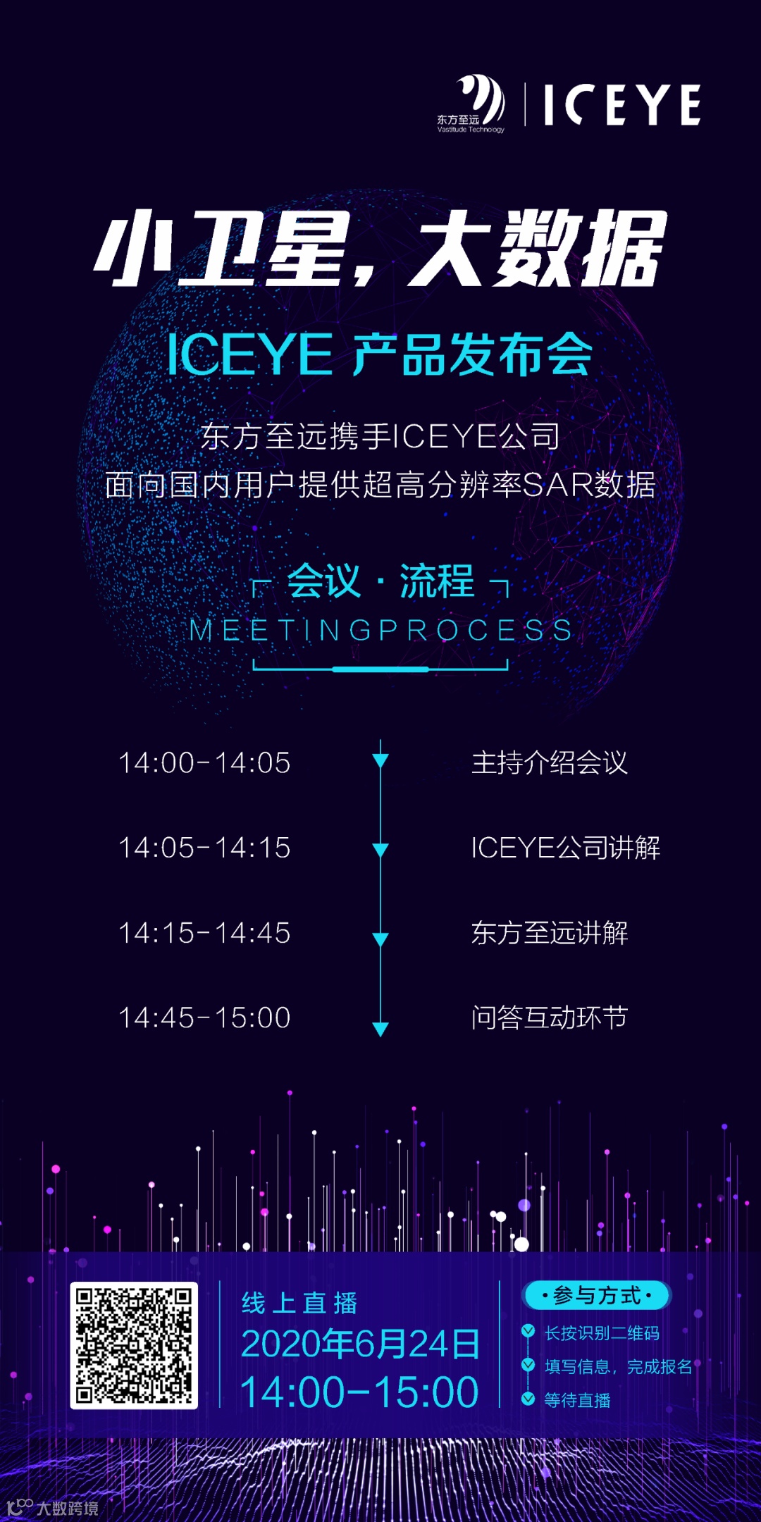 6月24日14:00-15:00,东方至远将在线上举办ICEYE产品发布会,与ICEYE公司高管共同解读卫星特点、应用场景、后续发射计划以及国内提供服务方式等,您可识别上图海报中二维码或点击下方【阅读原文】,准时收看。