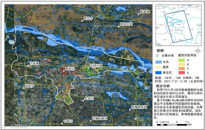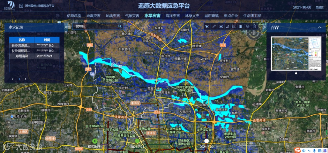 “720郑州洪水”事件,第一时间调度洪水前后数据,计算洪水淹没面积,利用遥感大数据应急平台的分析功能,融合长期变形数据,叠加最近的地质灾害、气象灾害、水旱灾害等信息,进行风险建筑的早期识别。