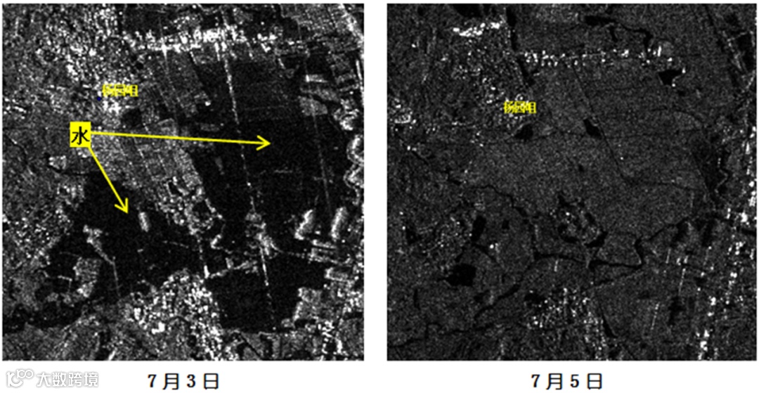 持续监测洪水灾害,能够为洪水应急辅助决策提供动态数据支撑。7月5日下午6时再次获取新洲区降轨数据,经过数据处理与分析,结果显示洪水水势变化明显,洪水明显减少。