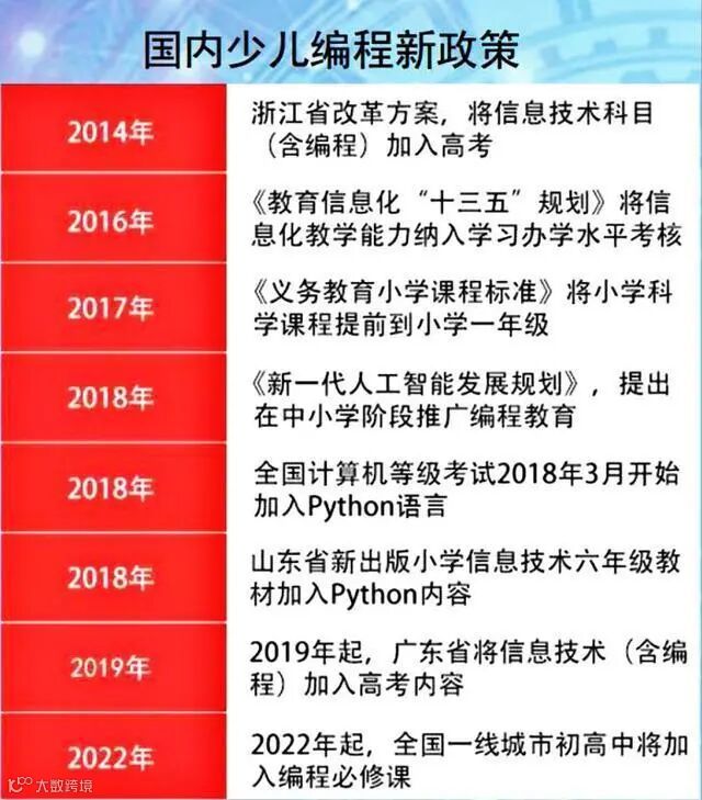 2000年以色列编程兴起;2012年日本改课推广编程;2013年奥巴马呼吁全国学编程;2014年英国把编程纳入必修课;2015年美国政府出资40亿强化中小学计算机教育;2016年澳洲把coding编程引入全国必修课;2017年4号文件提出中小学综合实践活动课程指导纲要编程成为必修课。2018年韩国全面推广中小学编程;2019年中国《青少年编程能力等级》标准发布,2020年日本新教科书在算术和理科方面,编程教育作为新的必修内容加入课本里。