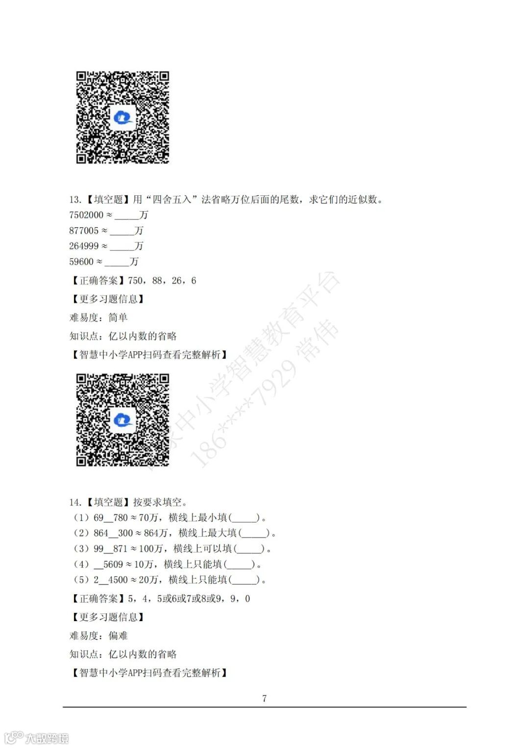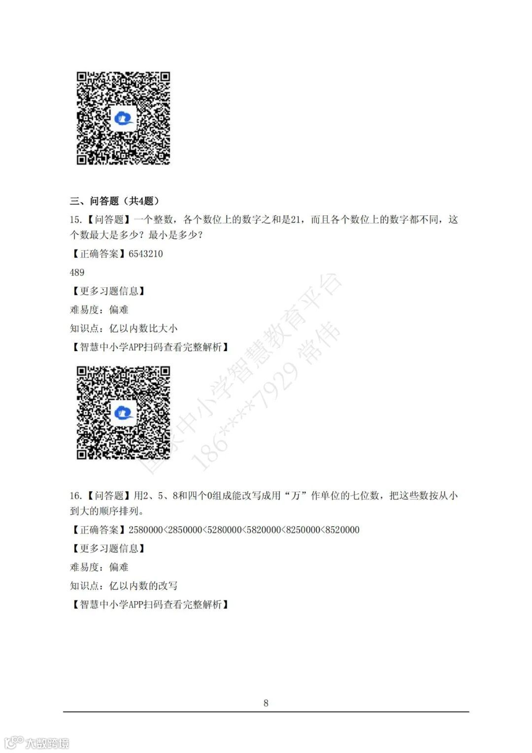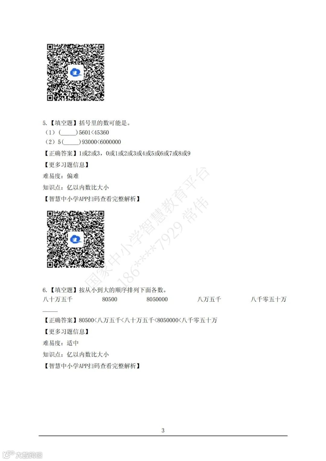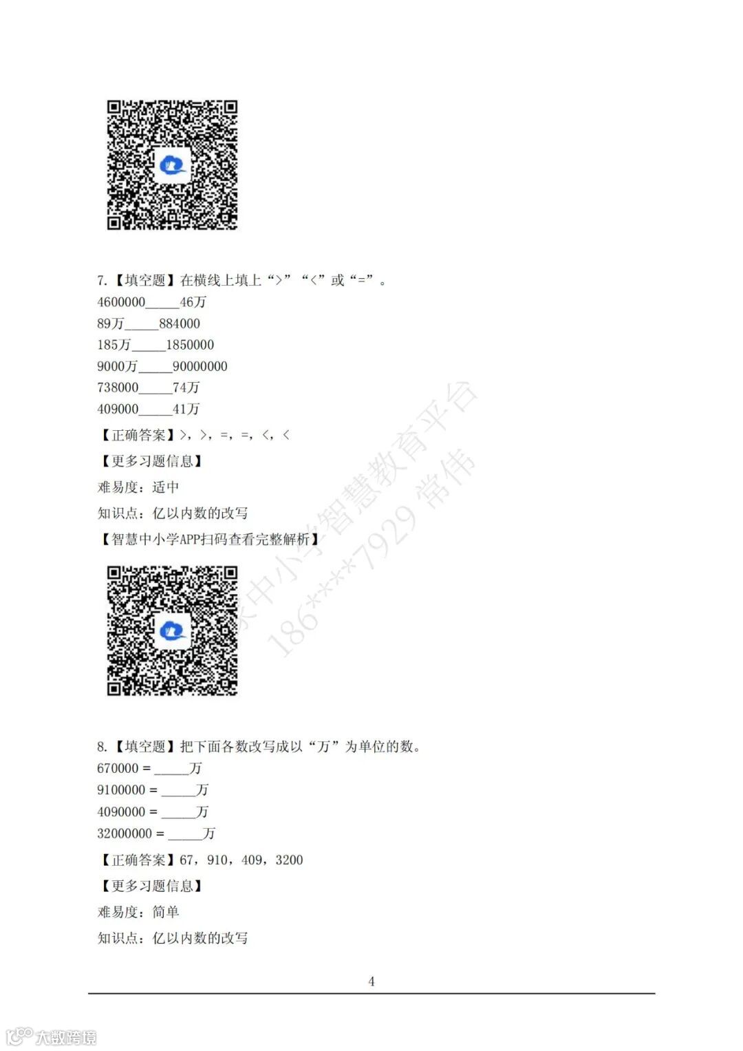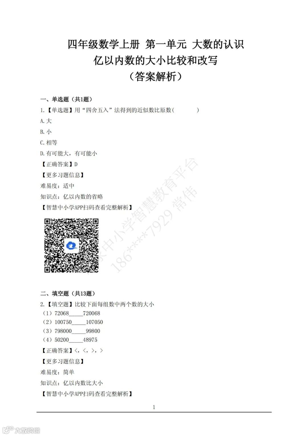 【智慧试题】四年级数学上册 第一单元 大数的认识 亿以内数的大小比较和改写 答案解析