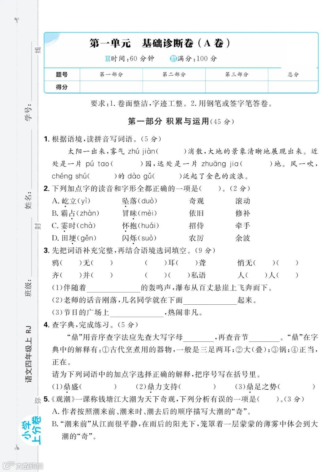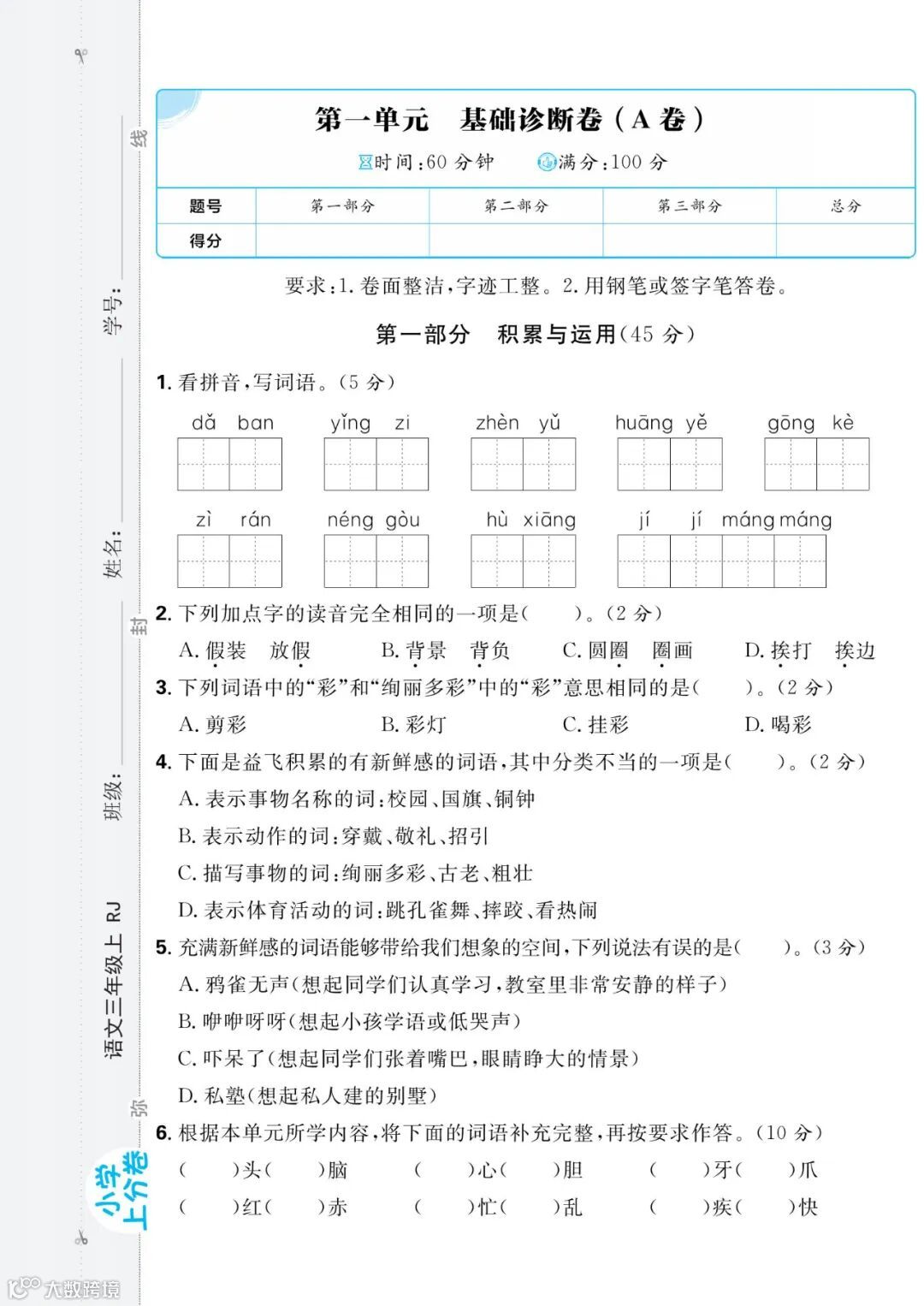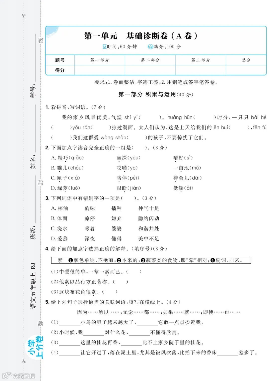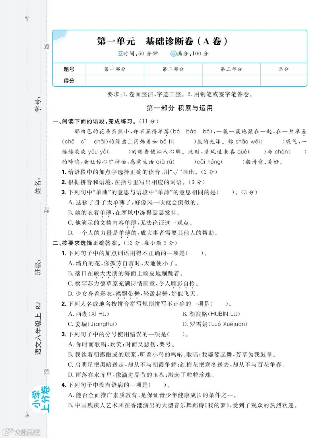 数智教师2024秋,小学1-6年语文1单元检测卷(含答案)可下载