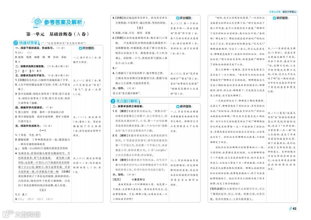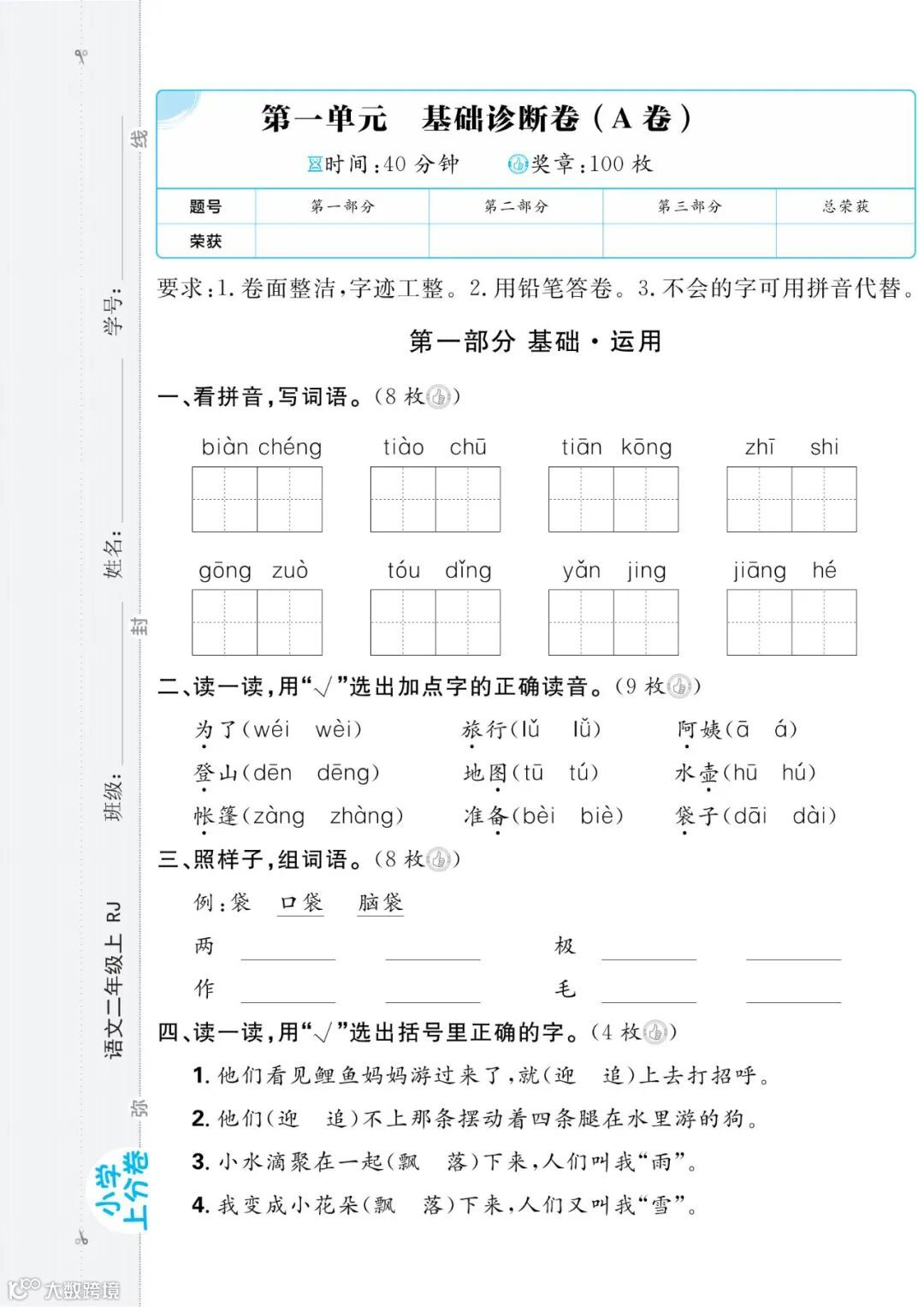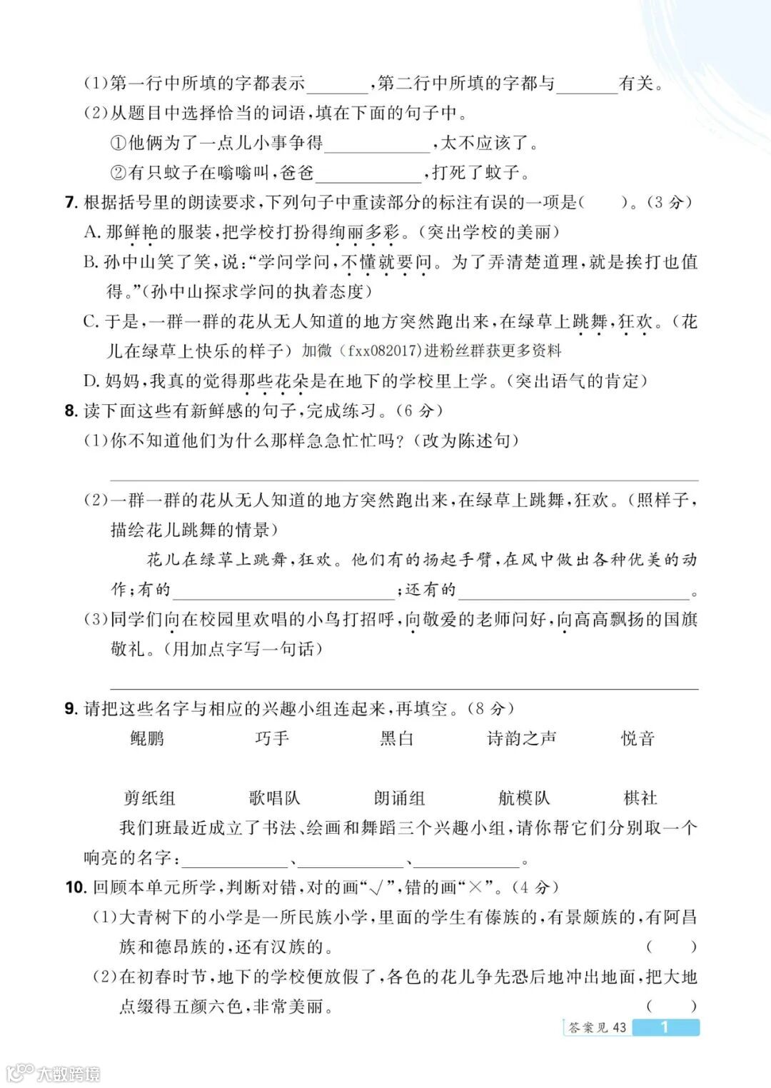数智教师2024秋,小学1-6年语文1单元检测卷(含答案)可下载