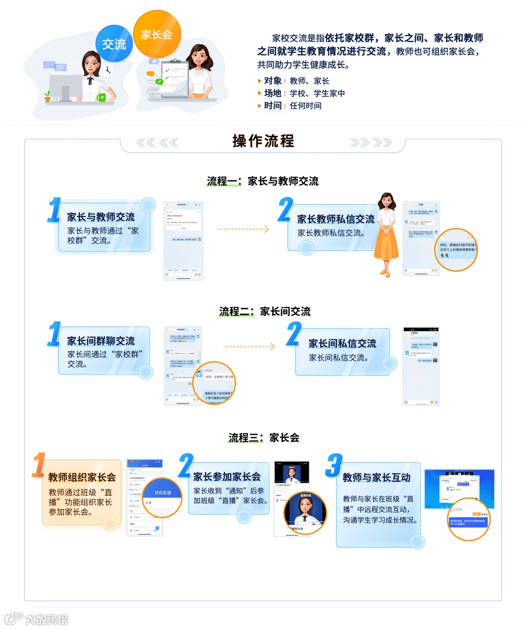 以平台功能为依托,建立家校育人共同体,针对需要家长与学校形成共识、协同合作的领域,运用平台中安全、心理健康、德育、双减等主题的数字教育资源,向家长宣传解读相关政策与教育理念,改变家长教育观。班主任在“家校沟通群”中推送家庭教育专家讲座,组织知识问答等活动;学校完善家校协同育人的制度建设和运作机制,运用家庭教育互助团体创新和丰富服务形式,借助平台中名师工作室的专家指导,保障家庭教育服务的权威性、专业性和匹配性。通过家校协同育人共同体,实现学校、家庭的联系与合作,帮助家长改变育人观,提升育人能力,推动学校与家庭协同育人,守护学生健康成长。
