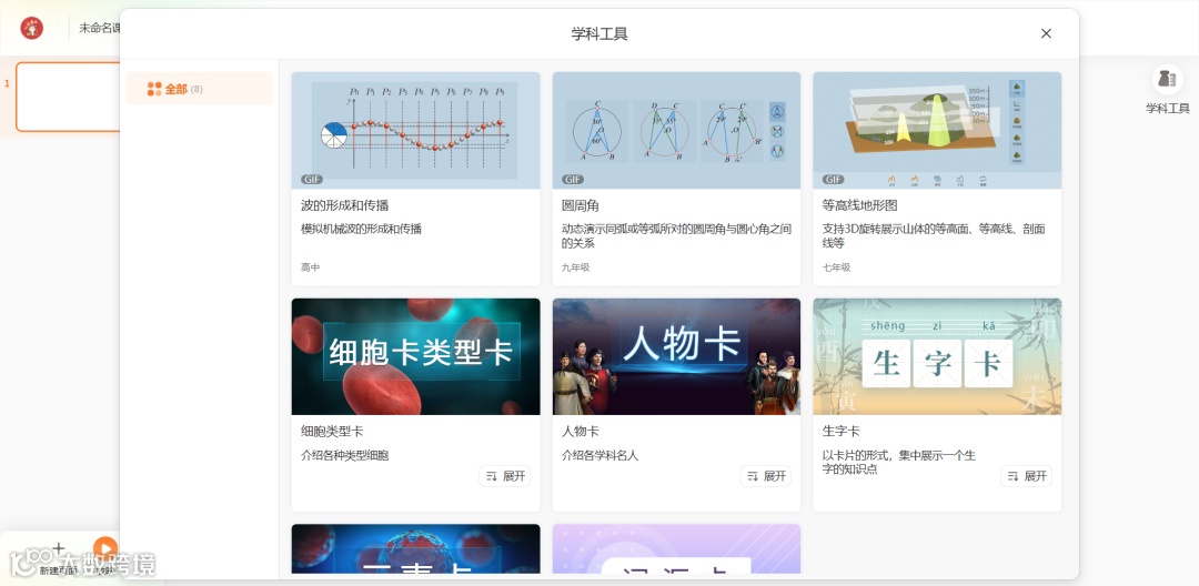 教师可以通过“学科工具”在课件中添加不同的工具以辅助学生理解课程中的动态过程或者知识点介绍。目前学科工具主要有gif动图和内容卡两种类型。教师点击“插入”将需要的工具放在课件后,点击“放映“就可展示工具中的具体内容。