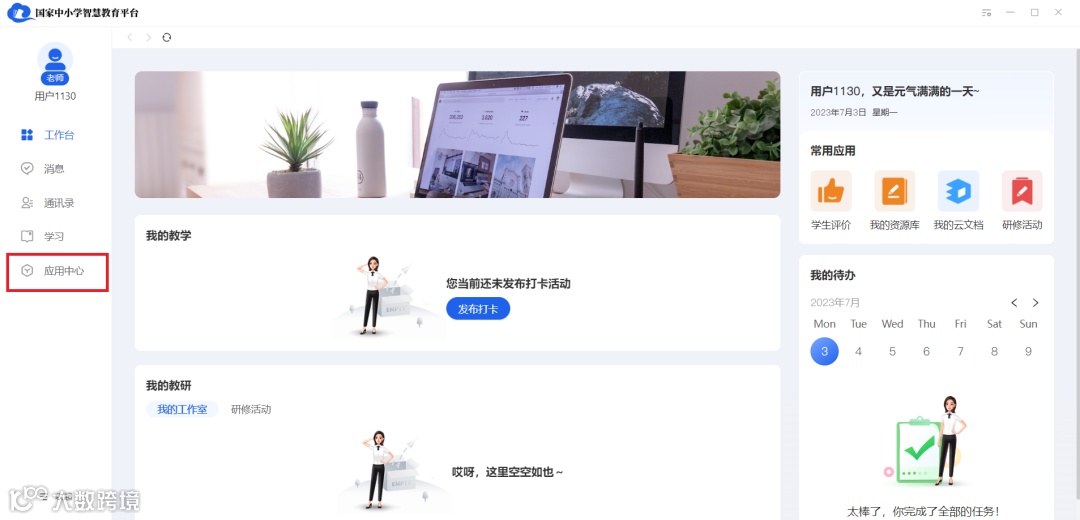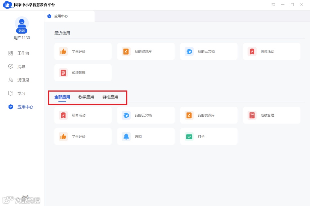 通过账号登录或APP扫码登录智慧中小学PC端后,用户在主界面“工作台”的左侧栏可以找到“应用中心”。不同角色的显示界面有所不同,接下来我们以功能最多的教师身份为例作以介绍。