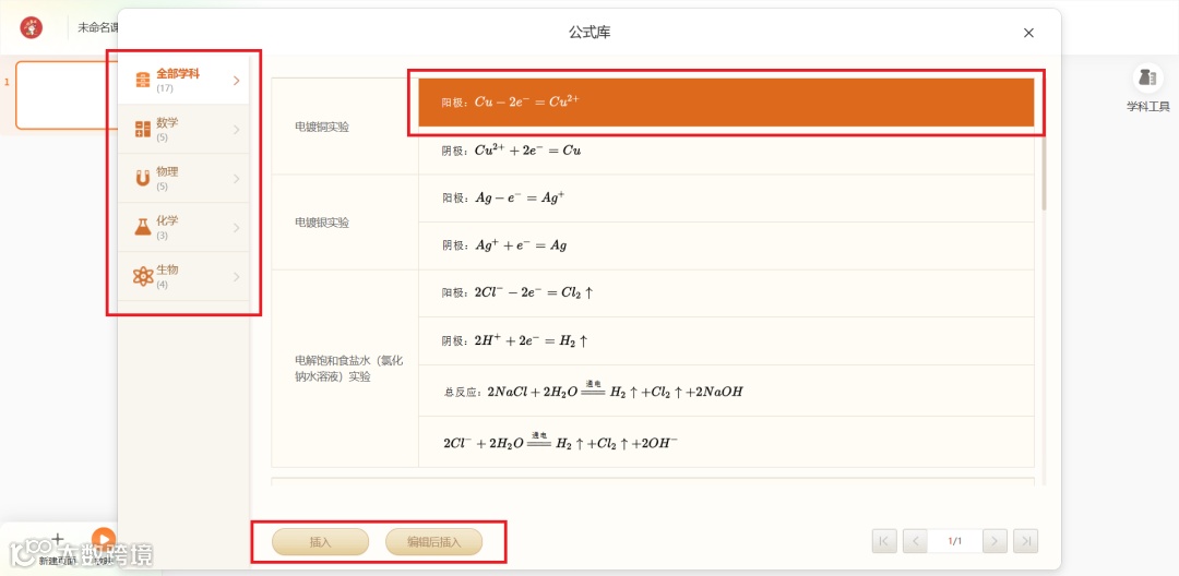 数学、物理、化学、生物教师可以通过“公式库”在课件中添加公式,便于辅助学生理解复杂的课程知识或实验内容。教师可以在左侧栏选择需要添加的公式类型,可以直接插入,或者对公式进行编辑后再插入。
