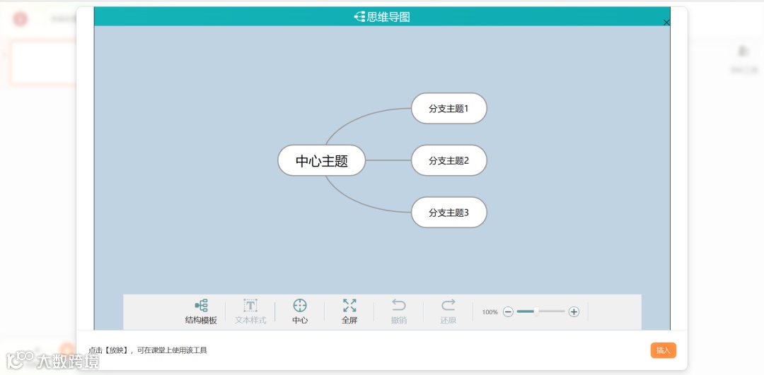 教师可以通过“思维导图”在课件中添加思维导图,帮助学生快速梳理所授课程的知识体系。通过下方的“结构模板”,教师可以选择不同的思维导图种类。运用“文本样式”和“中心”调整思维导图的文本格式或位置。最后,点击“插入”可以将构建好的思维导图放在课件中。