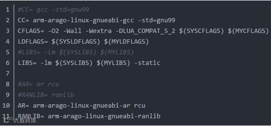 打开 src/Makefile 配置交叉编译环境。更新以下 CC、LIBS、AR、RANLIB 变量以及 linux 规则。