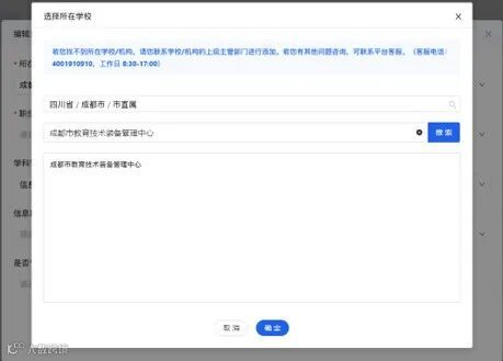 三、学校移除后,在对话框里面搜索新学校名称,找到后点确定,就完成了教师个人转校操作。