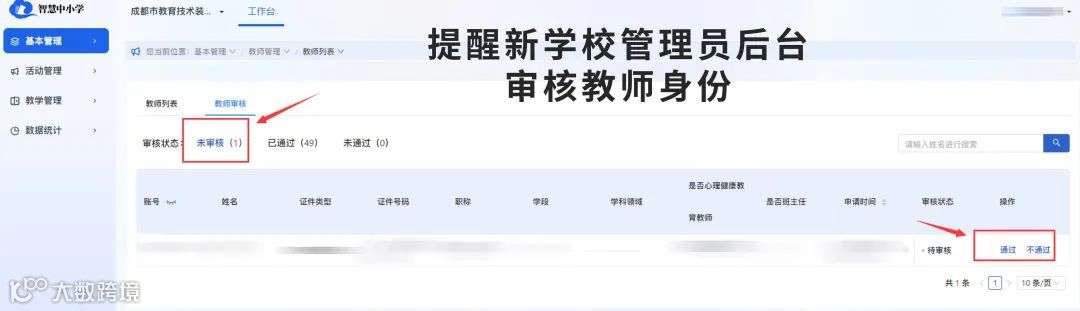 四、最后还需要提醒新学校管理员在后台审核教师身份,审核完成后,教师就完成了转校手续。