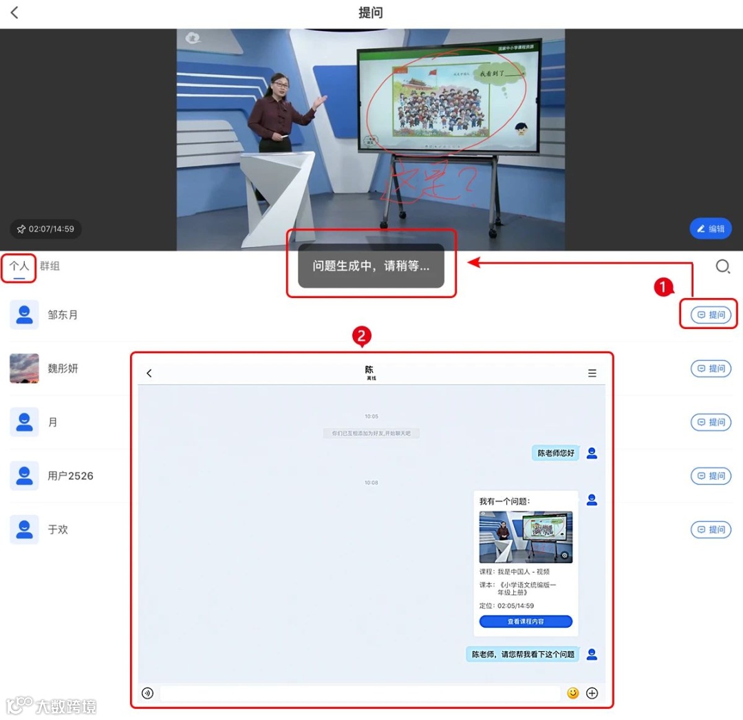 完成标记后,学生可以向【个人】提问,找到个人列表中想要提问的老师或同学,点击右侧的【提问】,就能将学习中遇到的问题发给对方,获得及时的解答和帮助。需要注意的是,如果学生和个人列表中的老师或同学不是好友关系,需先添加为好友再进行提问。