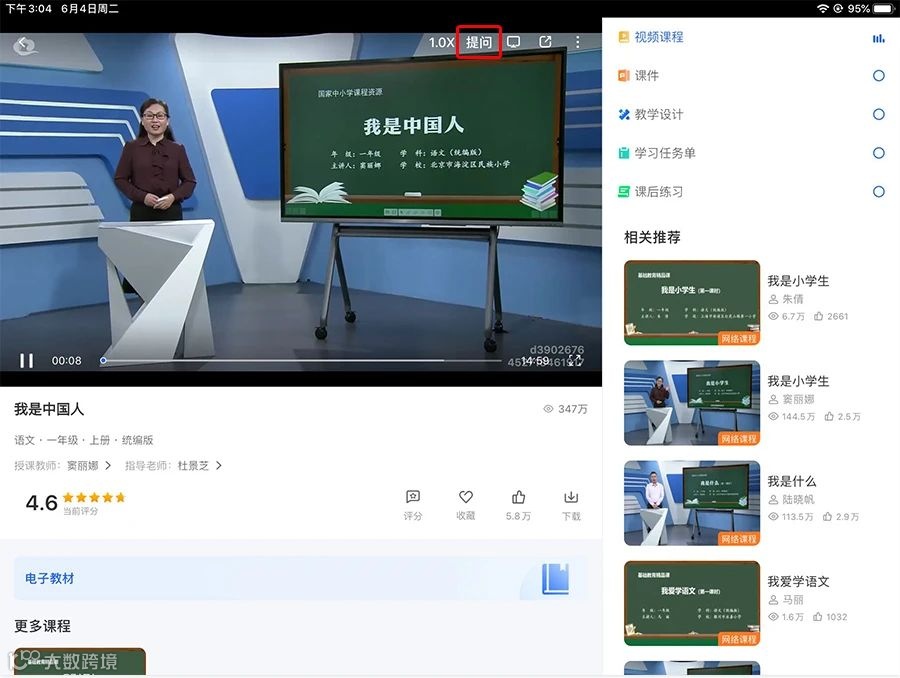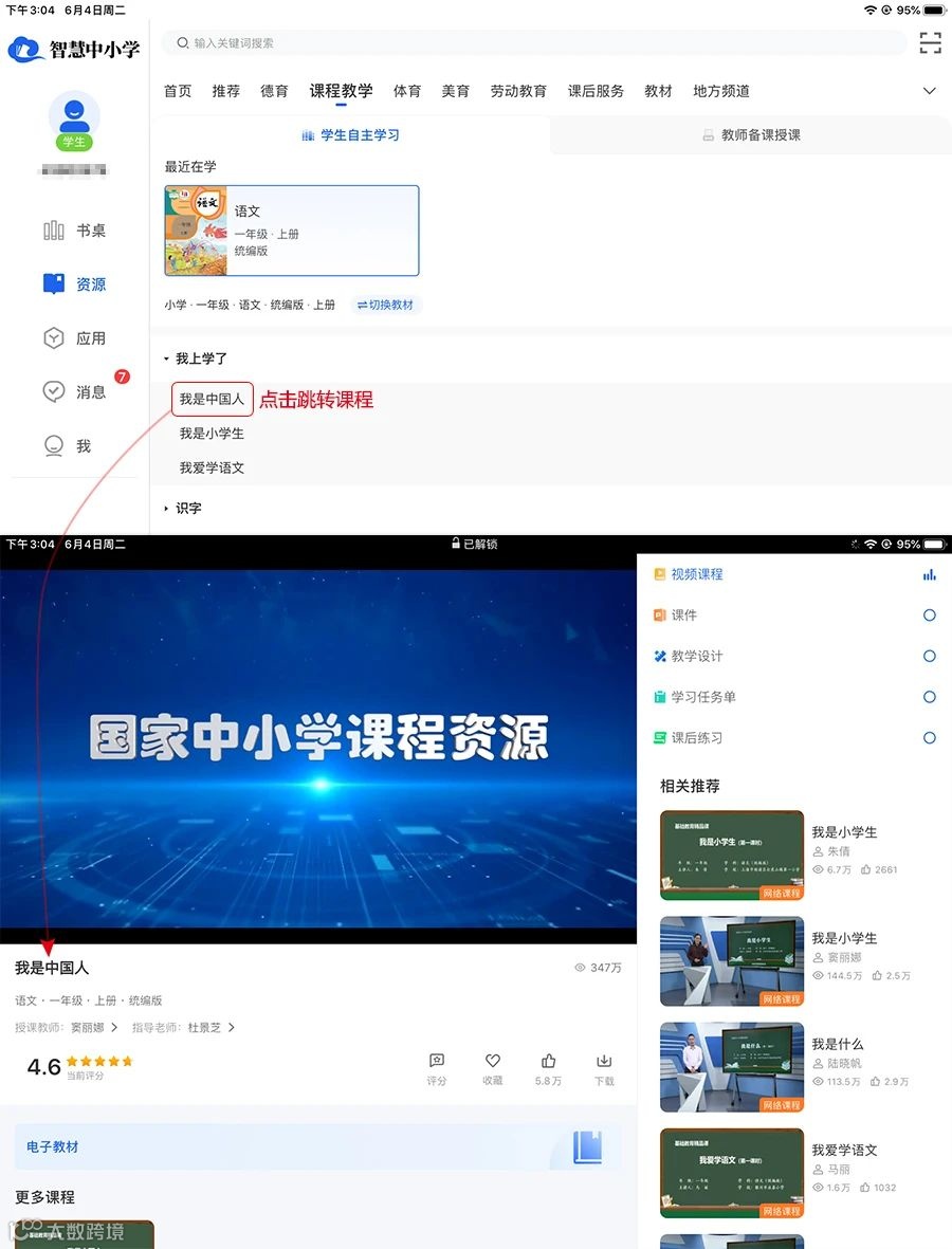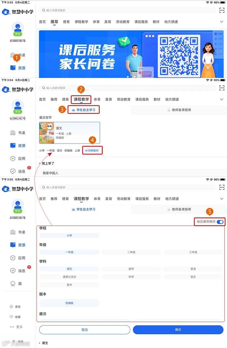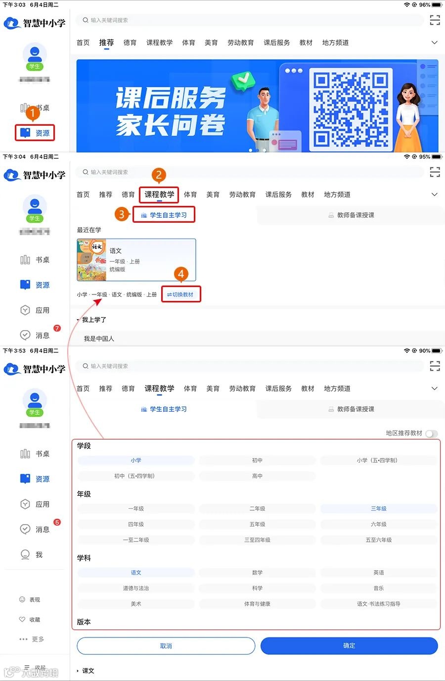 为方便学生预先了解未学习的知识,巩固已学习的课程内容,同时发展兴趣爱好,国家中小学智慧教育平台为学生提供了丰富的自主学习资源,支持学生在线学习,并通过提问、群聊等功能与教师、同学交流,更好地掌握所学知识。平台支持网页端、手机端、桌面端和平板端应用,学生可在任一端进行自主学习,但向教师、同学“提问”目前仅在手机端和平板端开放功能。本文就以平板端为例,展示如何完成这一系列操作。一、观看课程 STEP ①:学生可以通过平板端的【资源】-【课程教学】-【学生自主学习】-【切换教材】选取所需的学段、年级、学科、版本、册次,而后查看对应教材的学习资源。