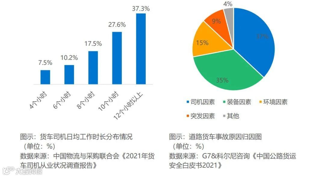 据《2021年货车司机从业状况调查报告》显示,84.2%的货车司机工作时长在8小时及以上,货车司机工作时间长、劳动强度大,疲劳驾驶状态非常严重,因此存在巨大的安全隐患。《中国公路货运安全白皮书2021》显示,道路货运的安全性因素复杂多元,但疲劳驾驶、超速行驶等司机驾驶问题是我国道路货运事故最主要因素,占比高达37%;其次是硬件设备装备不完善造成的视线盲区等问题占比35%;天气、路况等行驶周围环境的因素影响占15%。