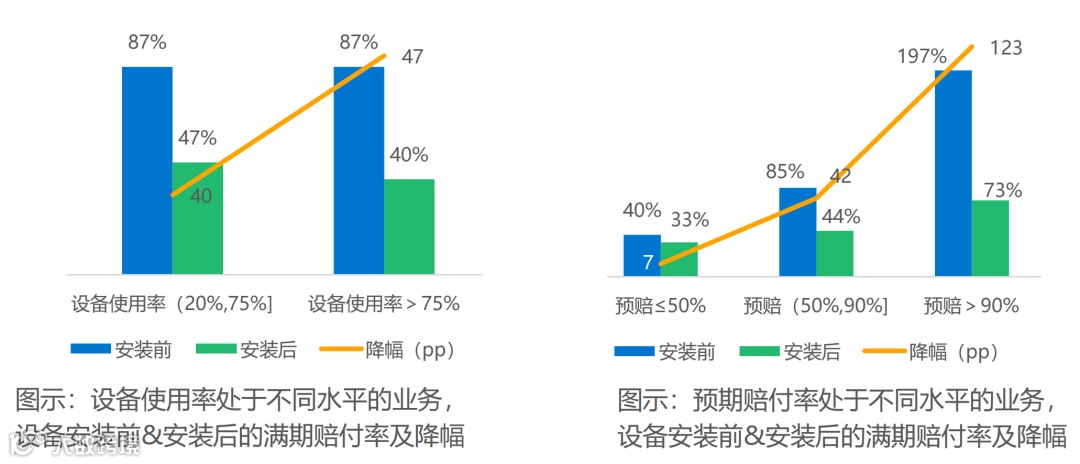 “主动安全” 系统将有效解决双方的发展难题,“主动安全”系统中的智能硬件设备例如ADAS、DMS等可以规范司机驾驶行为,预警危险驾驶操作,大幅降低追尾和各类刮碰事故。对于险企而言,“主动安全”系统在降低商用车事故率的同时也有效减少了事故赔付率。根据某险企理赔数据分析,主动安全系统安装后,商用车满期赔付率由86%降至44%。此外,主动安全智能设备使用率在75%以上和承保时预期赔付率在90%以上的业务,其满期赔付率 下降更为显著,可分别降低47%和123%,由此可知,主动安全设备的使用率越高,赔付率下降越明显,已然形成了正相关关系。